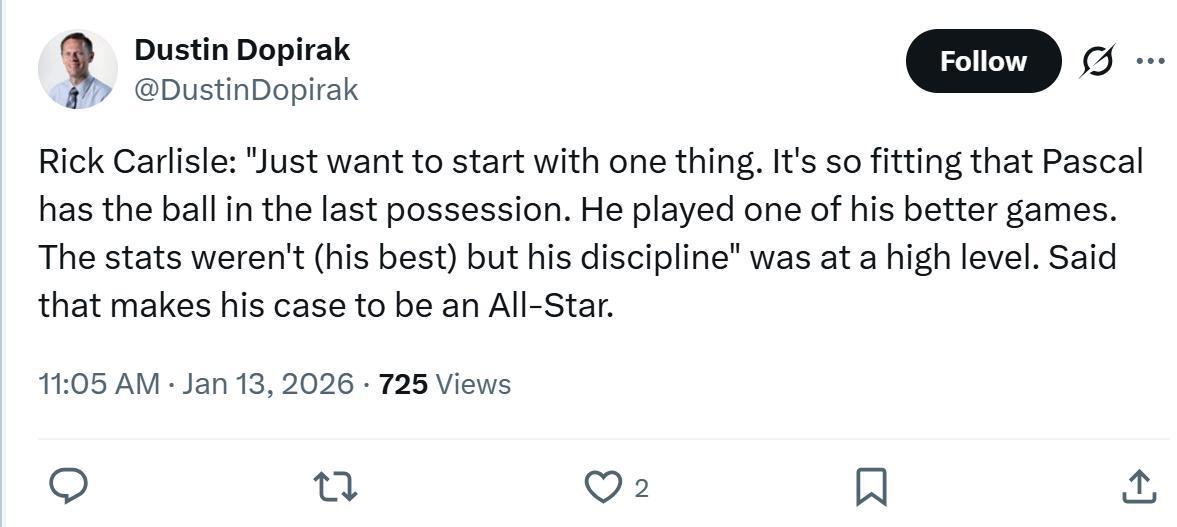 面对西卡这样的表现,步行者主帅卡莱尔赛后公开称赞道:“最后时刻的关键球让西亚卡姆处理是再合适不过的选择,这是他本赛季表现最好的比赛之一,虽然数据不算是最佳,但他的纪律性达到了极高水准。”